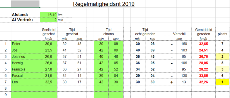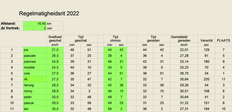 Jaarlijks wordt er een regelmatigheidswedstrijd binnen de Club georganiseerd. De bedoeling hierbij is om op een vast parcours van ongeveer 16 km, op voorhand te bepalen aan welke gemiddelde snelheid je de rit zal afleggen. Zo traag en zo snel je maar wilt. De rijders vertrekken om de 2 minuten en wie het dichtst bij zijn opgegeven gemiddelde snelheid komt wint de regelmatigheidsrit.